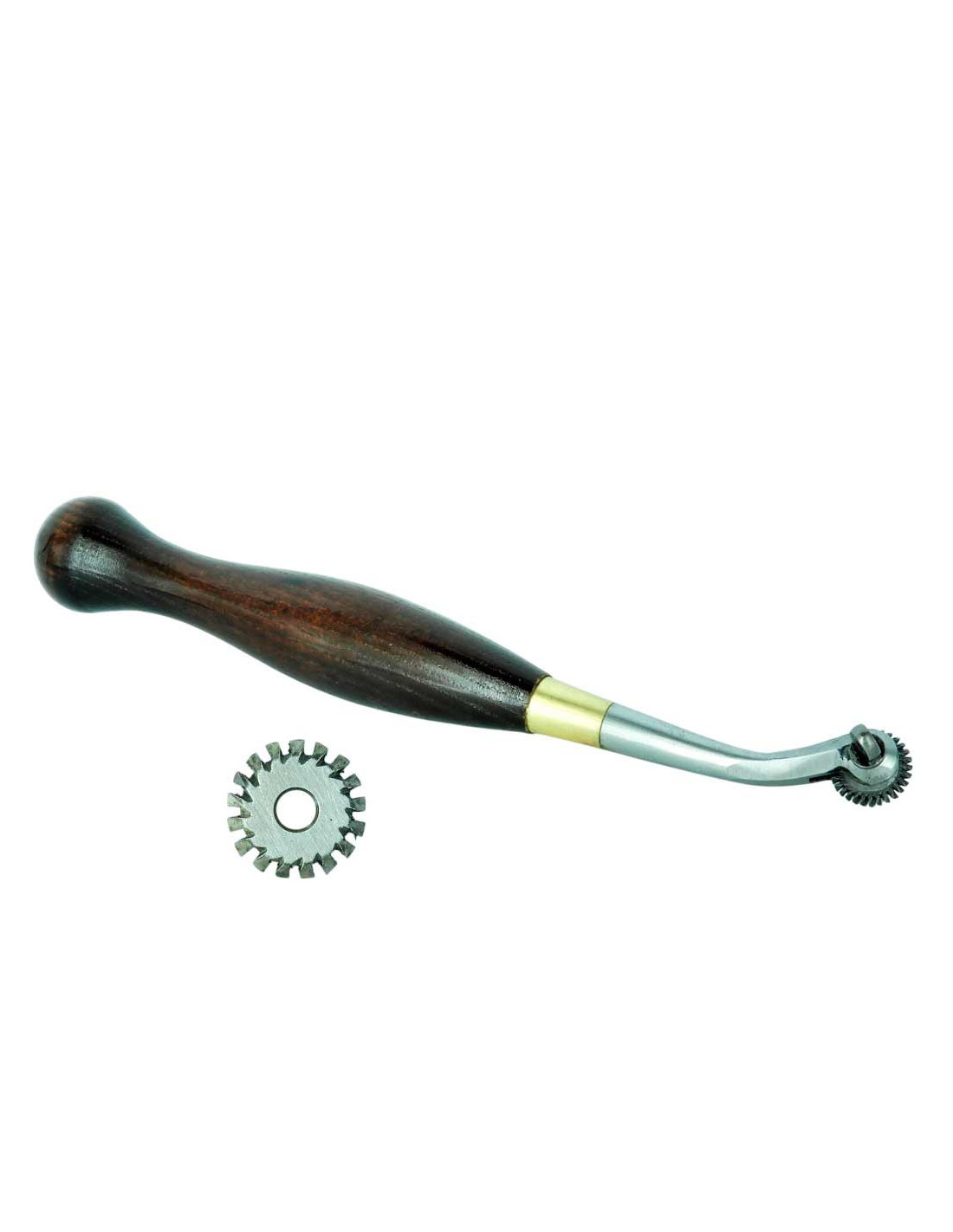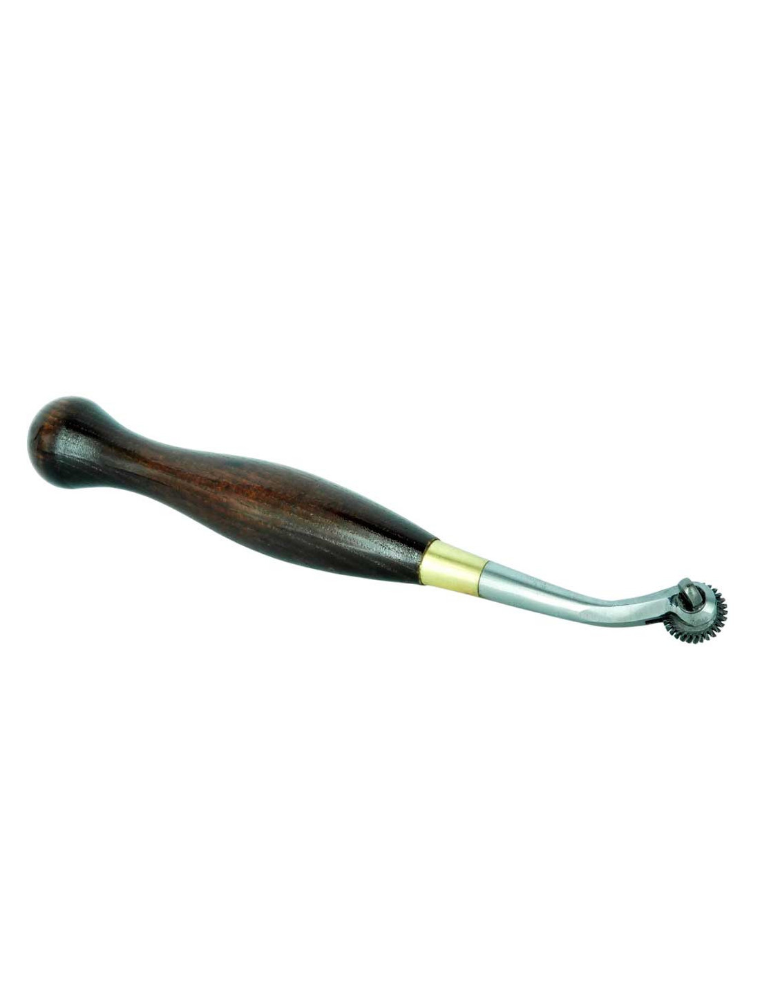 Herramienta para marcar el cuero, con rueda de 3.85 mm de separación entre puntadas. Mango de madera barnizada y estructura en acero forjado y latón.