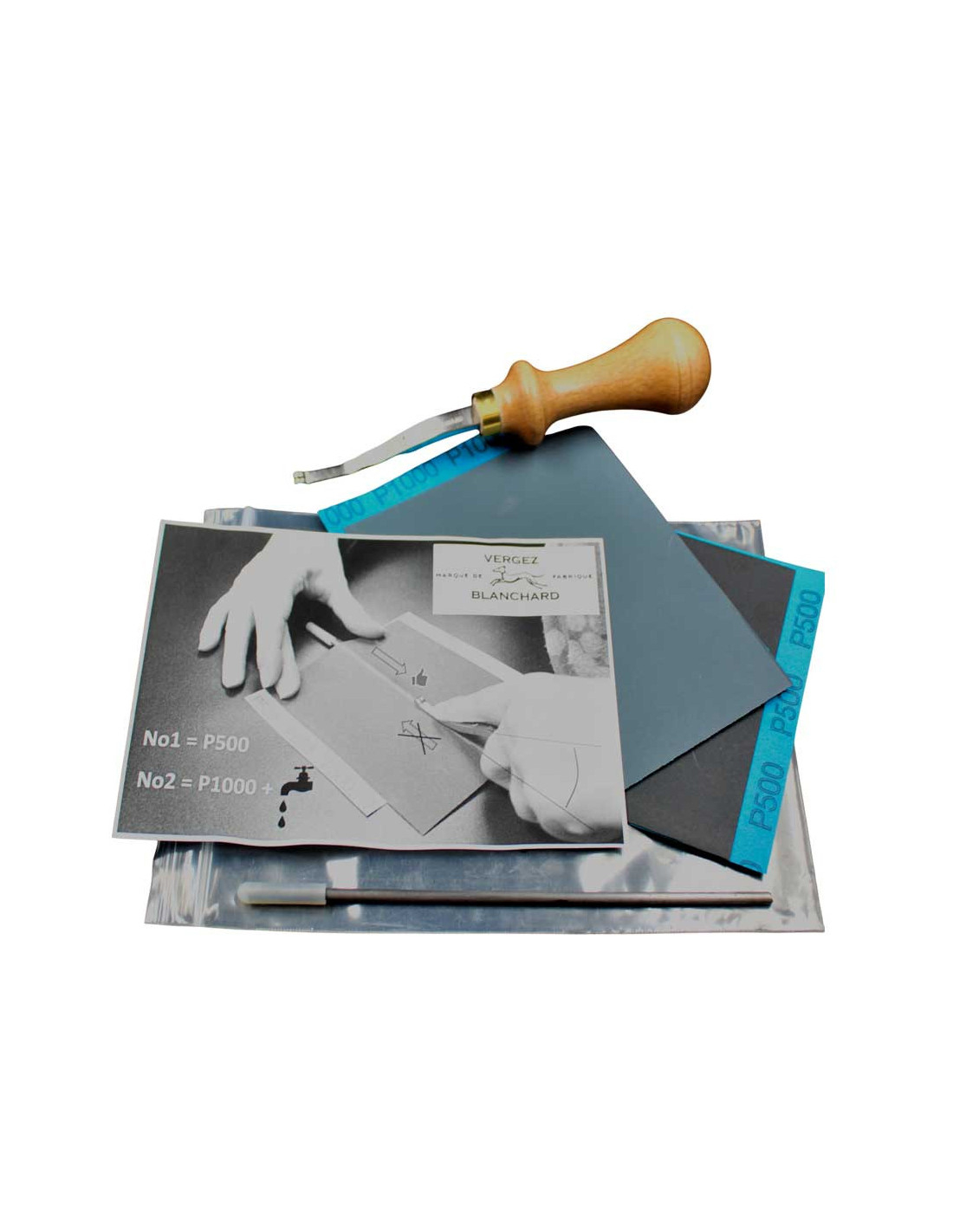- 2 folhas de lixa P500 (grão fino): formato A6 (105 x 148 mm), ideal para afiação inicial com água.
